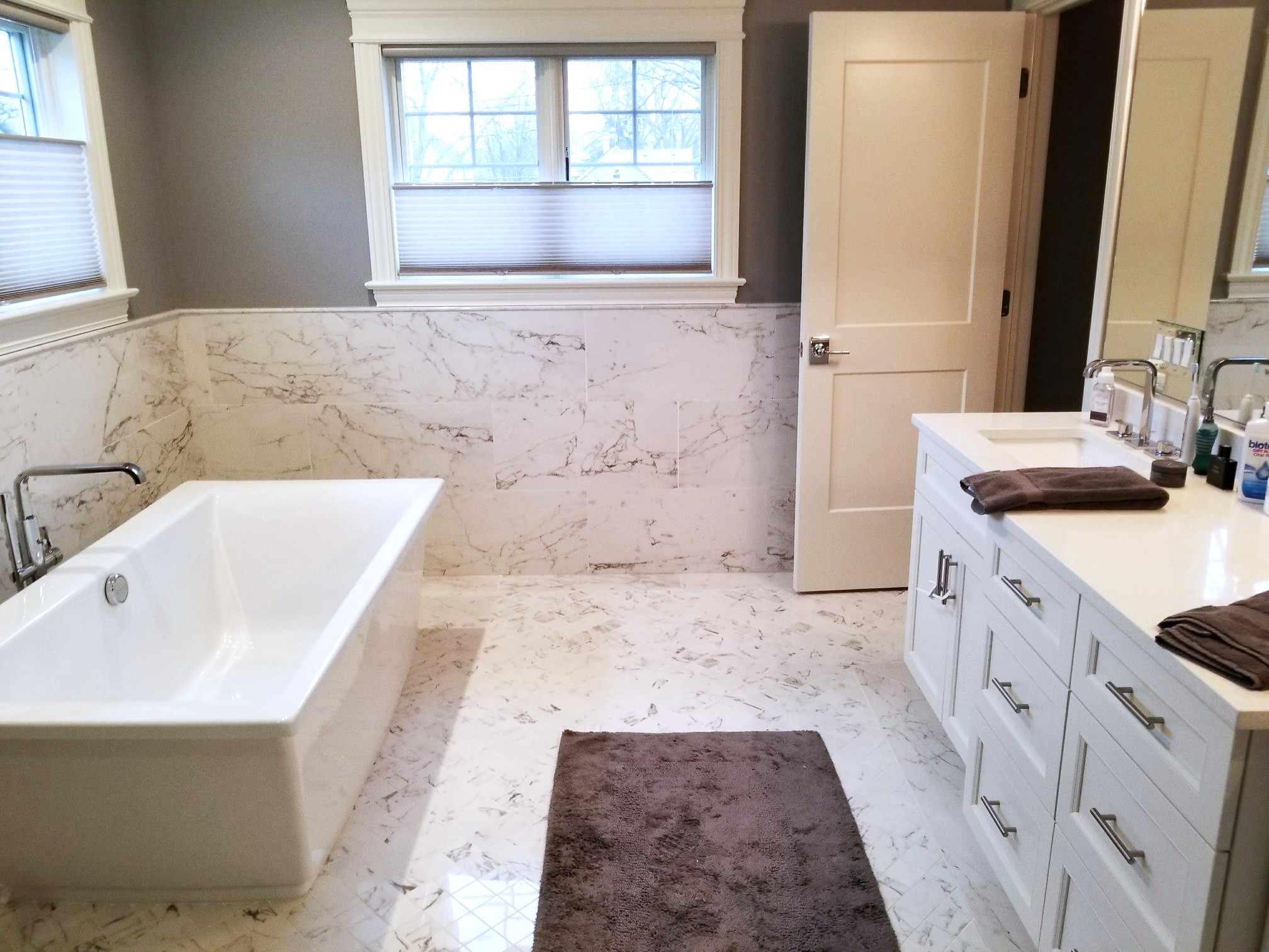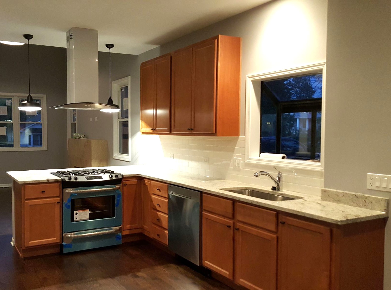 This included painting of cabinets, walls and trim, new quartz countertops, new marble backsplash, new can lights and under cabinet lighting, new sink and faucet, new island and new kitchen flooring.